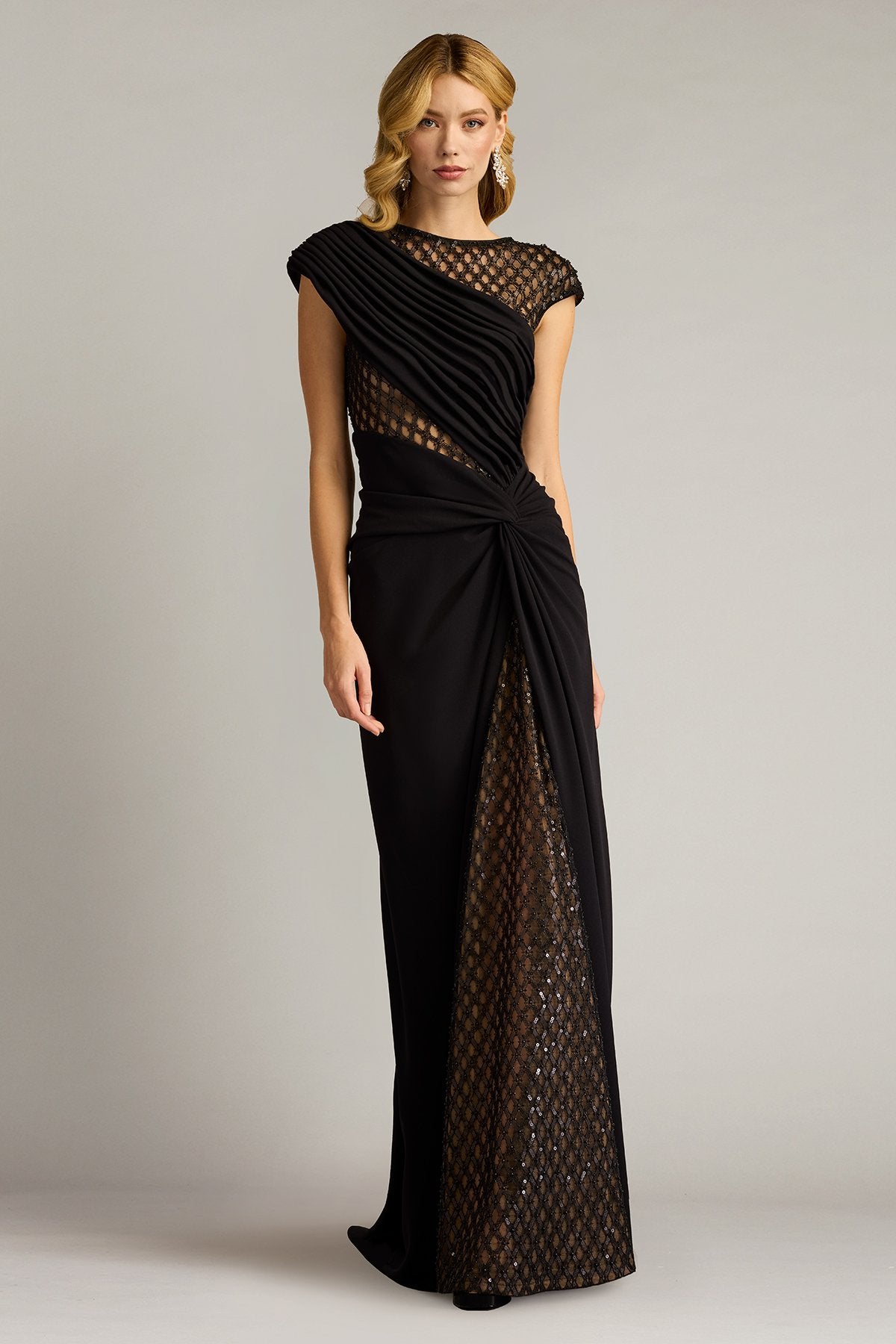 Sophistication abounds in our stunning evening gown that is rich with details. Intricate lacework covers the top with hints of skin peeking through and draping down over an elegant black skirt.